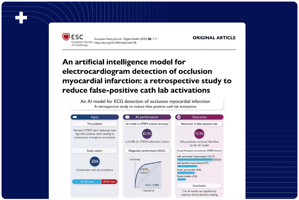 This single-centre retrospective study examined whether an AI-powered ECG model (PMcardio’s Queen of Hearts OMI model) can better detect acute occlusion myocardial infarction (OMI) and reduce false-positive cardiac catheterization laboratory (CCL) activations compared with traditional STEMI millimetre criteria. The authors analysed 304 consecutive STEMI pathway activations over a 2-year period at a tertiary academic centre and applied the AI model to pre-angiography 12-lead ECGs, comparing its performance against standard STEMI criteria. The AI model showed higher sensitivity (89.2% vs 68.3%), higher specificity (72.9% vs 51.7%), greater overall accuracy (82.9% vs 61.8%), and a high AUROC of 0.884 for identifying true OMI, while correctly flagging nearly three-quarters of false-positive activations as non-OMI. These findings suggest that integrating a specialized AI-ECG model into existing STEMI alert pathways could meaningfully reduce unnecessary CCL activations without compromising the detection of true occlusions.