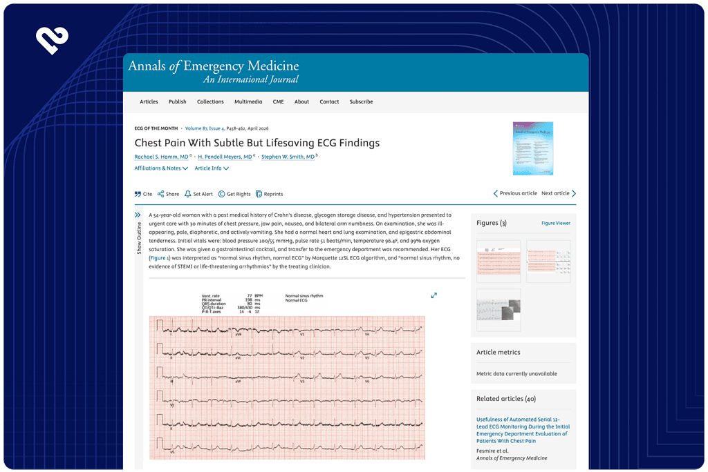 The patient presented with chest pain, nausea, and autonomic symptoms, but her initial ECG was interpreted as normal. Retrospective analysis demonstrated hyperacute T waves in leads V2–V5, with subtle (<1 mm) ST elevation.